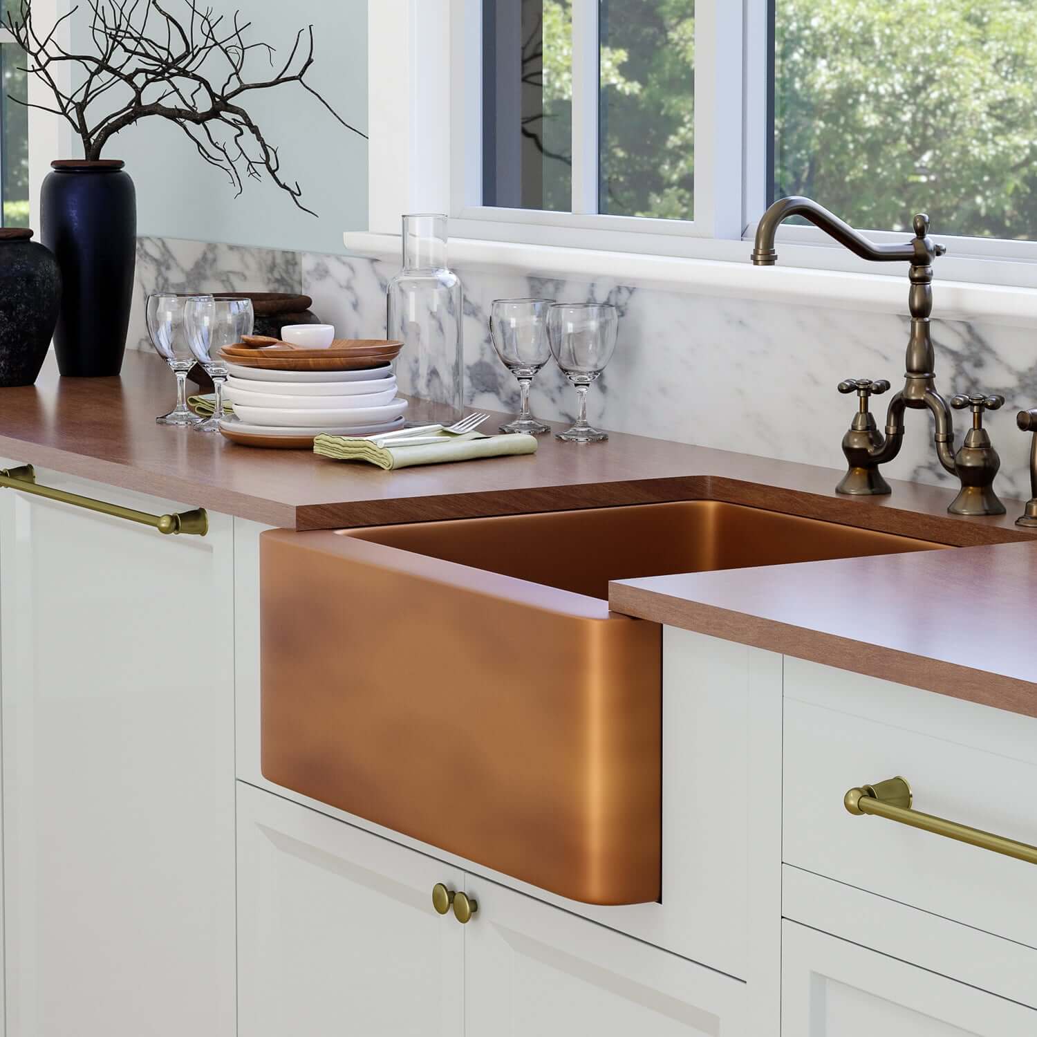 Apron front kitchen sinks in fire clay, copper, wood, stainless steel, and...