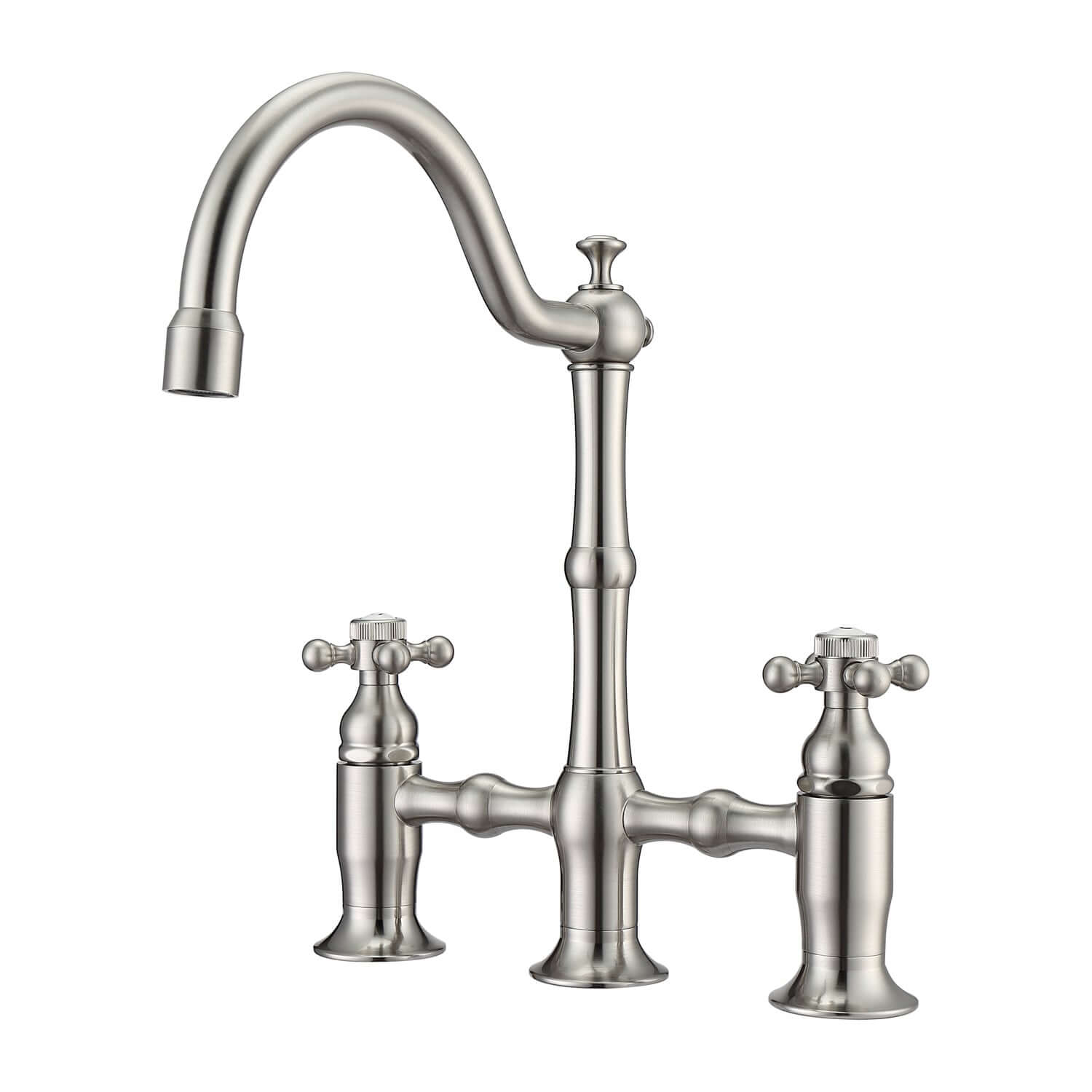 Bridged two-handle kitchen faucets with or without side sprayers.