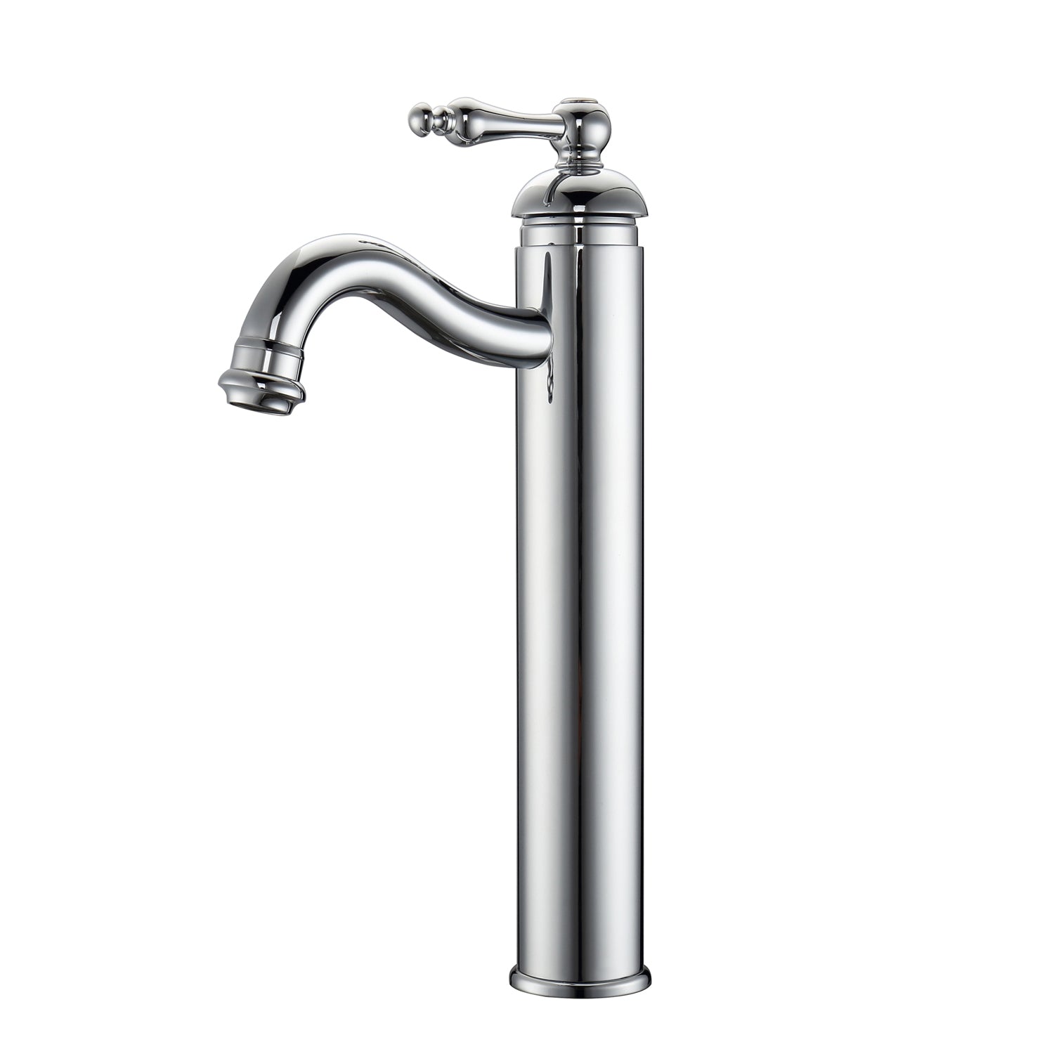 Tall, single-handled faucets for above counter vessel lavatory sinks.
